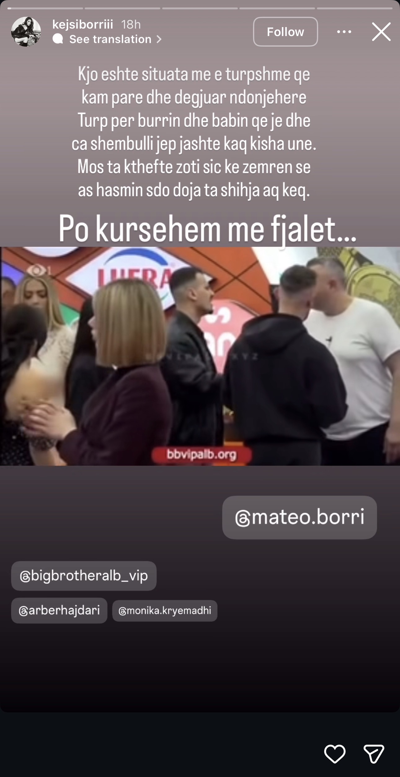 Ajo ka vijuar me tone të ashpra, duke mallkuar veprimin e tij por duke u përpjekur të ruajë etikën: “Mos ta ktheftë Zoti siç ke zemrën se as hasmin s’do doja ta shihja aq keq. Po kursehem me fjalët…”. Kejsi ka etiketuar në këtë postim edhe produksionin dhe opinionistët, duke kërkuar vëmendje për këtë rast.