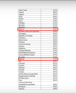 Lista përfshin Bangladeshin, me 54.8 përqind, Kosovën me 46 përqind dhe Shqipërinë me 41.3 përqind.